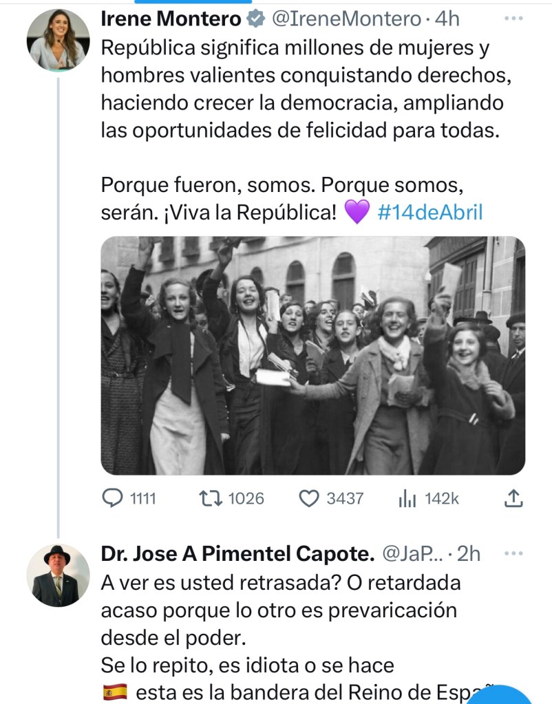 El pie forzado me lo ha dado la ministrosa, _ conjunción entre una persona que siendo ministra es a la vez una zarrapastrosa_, Irene Montero. Ha hablado de la Segunda República Española en presente continuo. Textualmente y previendo que pueda cuestionarme un comité censor en breve o cualquier ocurrencia comunista, pondré su publicación textual: