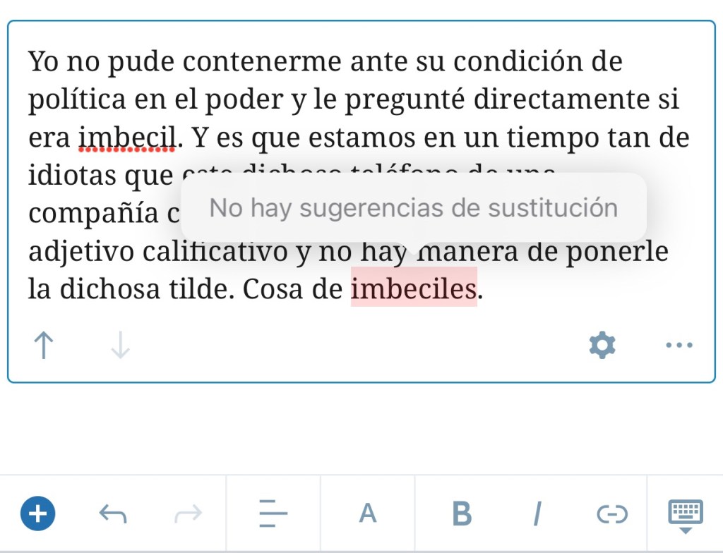 Yo no pude contenerme ante su condición de política en el poder y le pregunté directamente si era imbecil. Y es que estamos en un tiempo tan de idiotas que este dichoso teléfono de una compañía como Apple, no quiere reconocer el adjetivo calificativo y no hay manera de ponerle la dichosa tilde. Cosa de imbeciles.